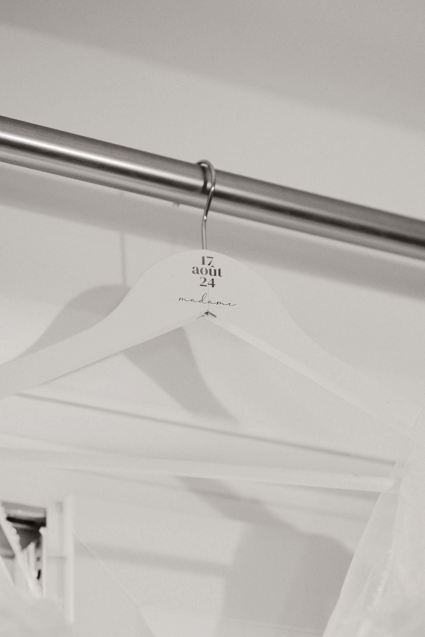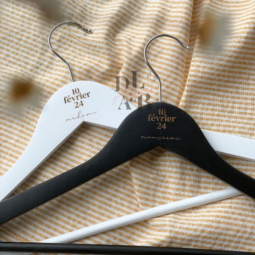 Ce cintre personnalisé est l’accessoire parfait pour sublimer une robe de mariée, un costume ou les tenues de votre team d’honneur. Il apportera une touche d’élégance à vos photos de préparatifs ou de cérémonie. Naturel, Blanc ou Noir