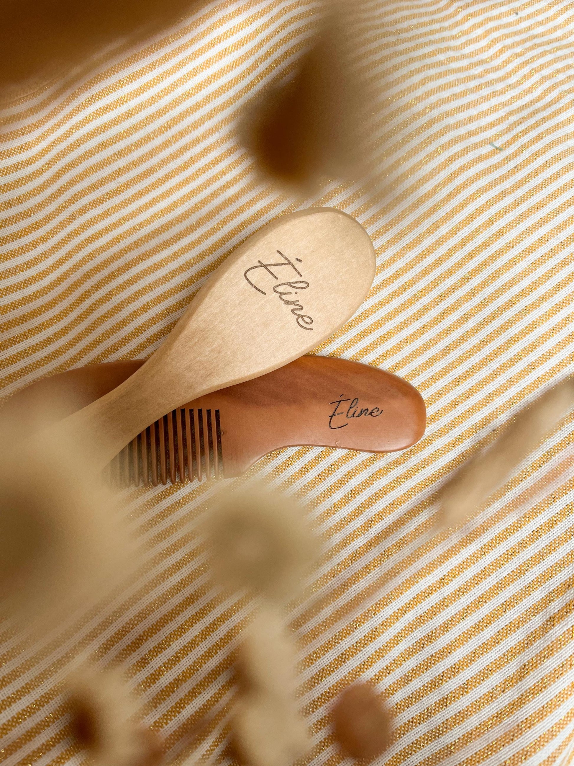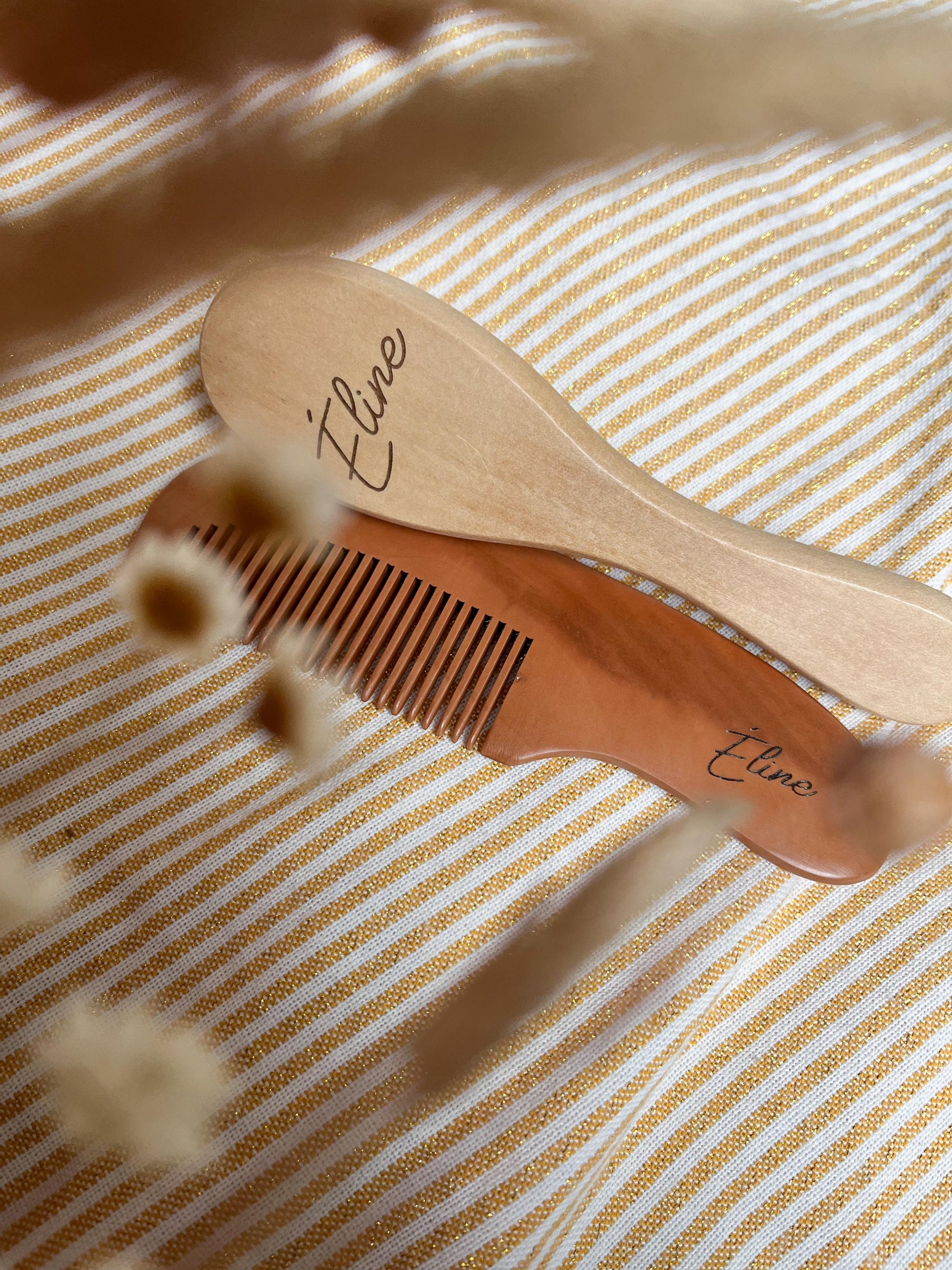 Lot brosse et peigne personnalisés avec leur pochon - Cadeau de naissance délicat